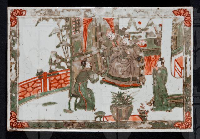 La targa fu creata per essere incastonata in un elemento di arredo (forse lo schienale di una sedia o un paravento), come suggeriscono i fori per pioli rettangolari collocati su entrambi i lati. Essa è decorata su entrambe le facce: da un lato con una scena di interno – forse di genere oppure di ispirazione letteraria – e dall’altro con un decoro floreale. Il decoro è effettuato con smalti della tavolozza famille verte iniziale, con prevalenza del rosso e del verde.