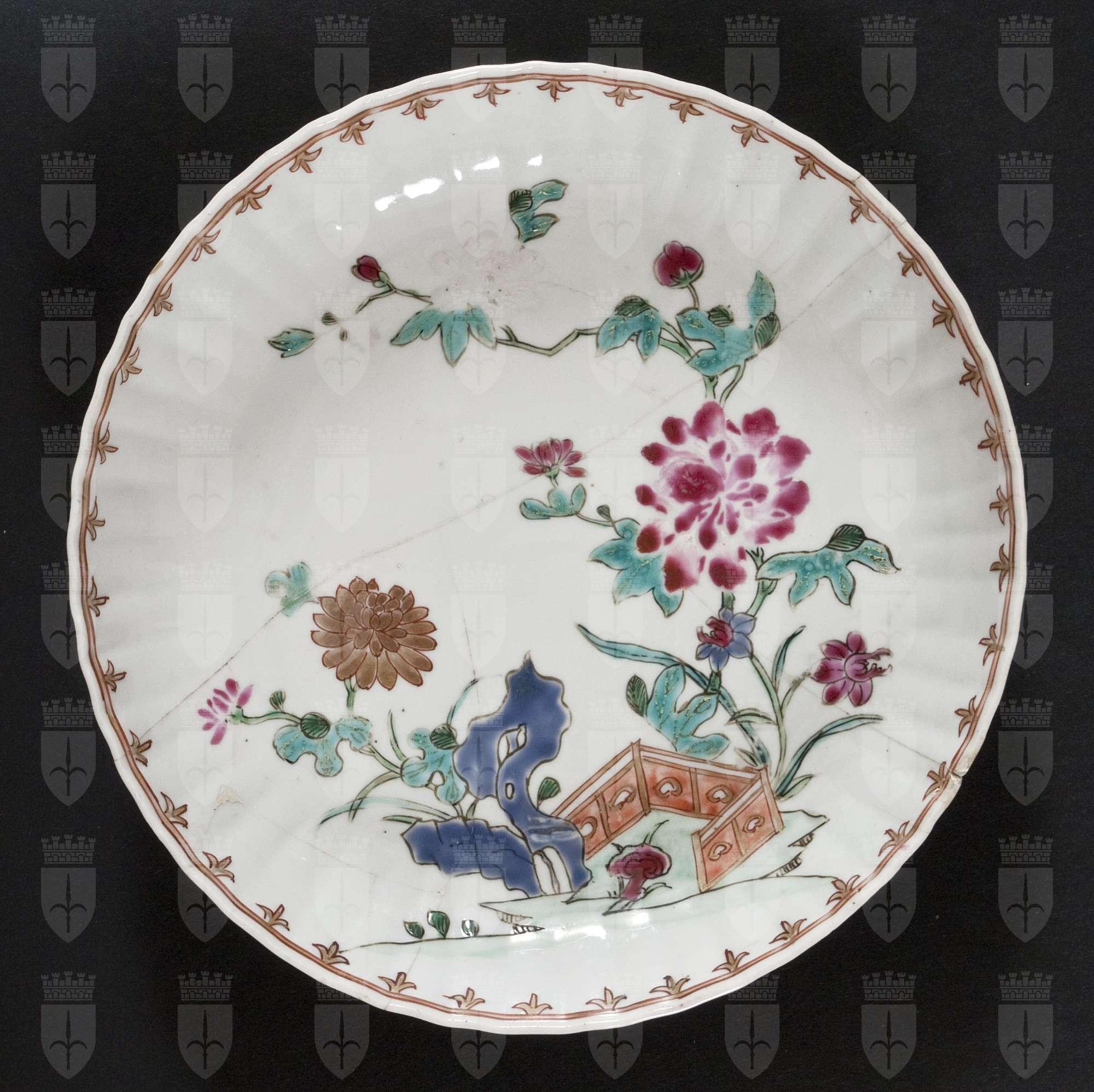 Il piatto mostra una combinazione di motivi occidentali e orientali: la forma baccellata è ispirata agli argenti europei e la bordura “a punte di lancia” è tipica delle porcellane di Meissen, mentre è propriamente cinese il motivo augurale centrale dei tralci di crisantemi e peonia arborea in un giardino interno, sintetizzato nel recinto, con roccia taihu.