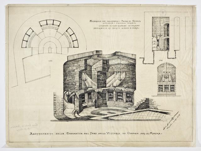 Si tratta di uno dei disegni progettuali del Faro della Vittoria, eseguiti da Arduino Berlam, che li donò ai Civici Musei di Storia ed Arte nel 1935, cfr. le schede da CMSAOAR06_3598 a CMSAOAR06_3634. In particolare, la tavola descrive l'adattamento delle casematte del Faro a ossario della Marina. A partire dal 1919, Arduino Berlam lavorò alla progettazione del Faro della Vittoria, architettura celebrativa e simbolica, che rispondeva al desiderio di esaltazione della patria e dell’italianità di Trieste redenta, sorto dopo la Grande Guerra, e alla necessità di onorare i suoi caduti. Già durante il conflitto, Berlam aveva ipotizzato di erigere un faro in onore di Nazario Sauro, eroe del mare, sulla punta istriana di Salvore, a poca distanza da Capodistria (cfr. CMSAOAR06_3631). Tuttavia questa prima idea fu modificata a guerra conclusa, quando la Lega navale propose di costruire il faro a Trieste, per sostituire l’obsoleta lanterna di Pietro Nobile. Dal giugno 1919, quando il progetto di massima venne approvato dal Consiglio Superiore dei Lavori Pubblici a Roma, al 1927, quando il faro fu inaugurato, il suo iter costruttivo fu tormentato da problemi e ritardi causati da divergenze di ordine tecnico-artistico e dall’antagonismo contro Arduino Berlam. Edificato sulle fondamenta del forte austriaco Kressich, costruito sul colle di Gretta nel 1854, su progetto dell'architetto Karl Möring, il faro presenta una gradinata monumentale alla cui sommità si trova un solettone. Su di esso è posta la lapide con l'epigrafe dedicatoria «A. D. MCMXXVII / SPLENDI E RICORDA / I CADUTI SUL MARE / MCMXV – MCMXVIII». Il manufatto prosegue con uno zoccolo a campana da cui pende l'àncora del caccia-torpediniere Audace, che il 3 novembre 1918 attraccò sul molo triestino ad esso intitolato. Sull'avancorpo del ballatoio, da cui si innalza il fusto della colonna, poggia la statua del Marinaio ignoto, eseguita da Giovanni Mayer. La colonna, in cemento armato, è rivestita da blocchi di pietra di Orsera e termina con un capitello che sorregge il terrazzo su cui poggia la lanterna. Quest'ultima è circondata da un ulteriore ballatoio in ferro ed è coronata da una cupola di rame a squame, su cui svetta una Vittoria alata, opera anch'essa di Mayer, forgiata da Giacomo Sreboth.