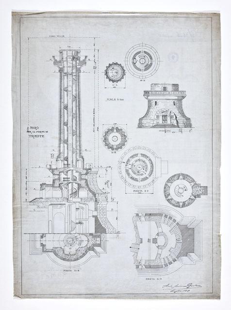 Entro linea di margine, disegno quotato raffigurante la sezione in alzato del Faro della Vittoria fino al secondo ballatoio con planimetrie relative a diverse altezze dello spaccato, indicate con lettere dell'alfabeto; alzato dello zoccolo a campana con accesso al Faro. Scala 1/100.