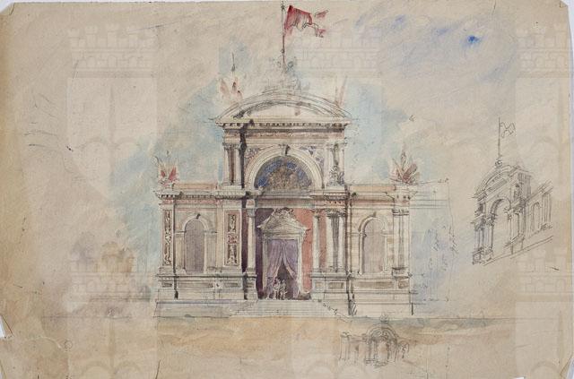 La tavola contiene due schizzi a matita e un progetto, rifinito ad acquerello, per la facciata di un padiglione. Sul verso, schizzo planimetrico non identificabile e calcoli matematici.