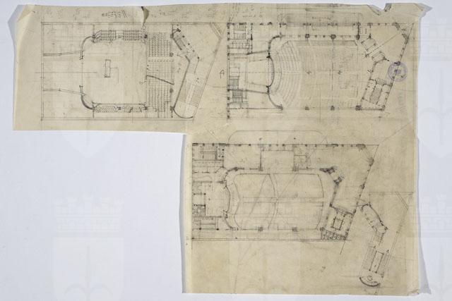 La tavola contiene tre planimetrie relative a diversi livelli di un cine-teatro parzialmente quotate. Calcoli matematici lungo il margine superiore.