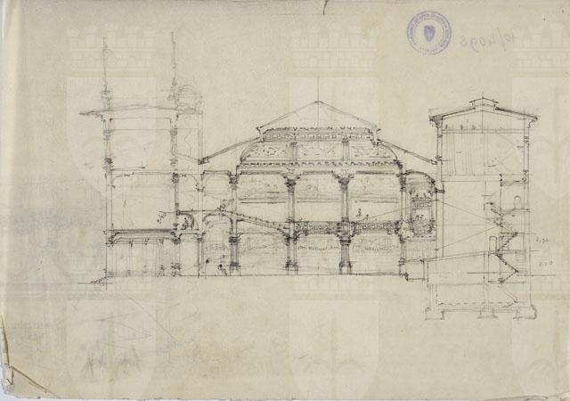 Disegno parzialmente quotato raffigurante spaccato di cine-teatro, sul recto; dettaglio dello stesso spaccato, sul verso.
