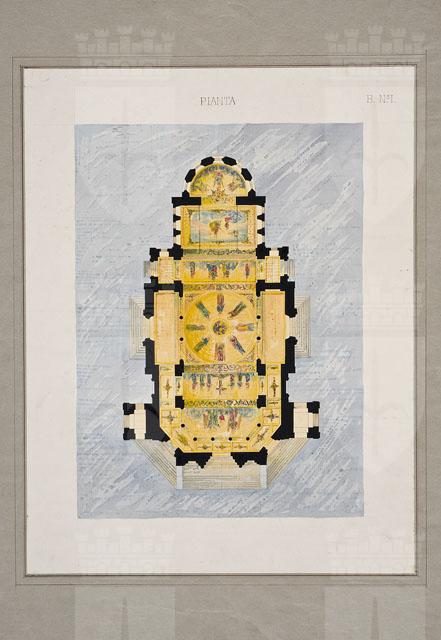 Un passe-partout riquadrato incornicia un disegno ad acquerello: entro campo dipinto di azzurro, planimetria di una chiesa a navata unica con due campanili laterali a base quadrata, che affiancano la facciata, e transetto, inscritto nel perimetro della chiesa, coperto da cupola. In corrispondenza dei diversi ambienti, sono tratteggiati verosimilmente i soggetti decorati sulle volte.
