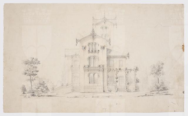 Si tratta di un progetto di villino, sviluppato anche in altre due tavole (cfr. CMSAOAR10_4140 e CMSAOAR10_4142), ove elementi di gusto Rundbogenstil sono accostati ecletticamente ad altri propri della casa rustica in legno. Acquistato per le civiche collezioni da Lituano Samero nel 1953, il disegno, sulla scorta di un'iscrizione vergata da mano ignota, è stato attribuito a Giovanni Andrea Berlam.