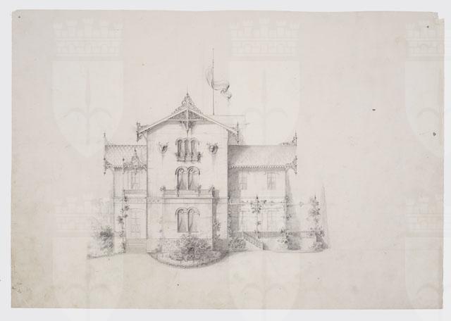 Si tratta di un progetto di villino, sviluppato anche in altre due tavole (cfr. CMSAOAR10_4140 e CMSAOAR10_4141), ove elementi di gusto Rundbogenstil sono accostati ecletticamente ad altri propri della casa rustica in legno. Acquistato per le civiche collezioni da Lituano Samero nel 1953, il disegno, sulla scorta di un'iscrizione vergata da mano ignota, è stato attribuito a Giovanni Andrea Berlam.