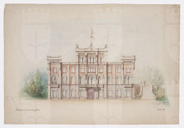 Disegno acquarellato per la facciata di un palazzo in scala 1:100, attorno è tratteggiato sommariamente un giardino.