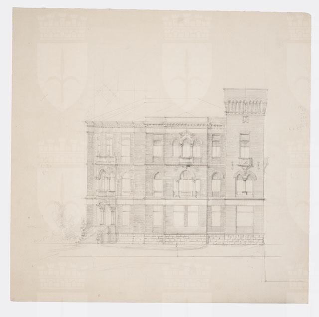 Disegno a matita raffigurante progetto per un villino a tre livelli, delimitato a destra da una torretta, e con accesso sulla facciata d'angolo caratterizzata da un loggiato; finestre archiacute al primo e secondo piano, organizzate in monofore, bifore o trifore. Il tratteggio parallelo a matita indica un paramento murario in cotto.