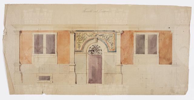 Disegno quotato a matita e acquerello di una facciata al livello del piano d'accesso. Quattro paraste di ordine ionico scandiscono la facciata, suddividendo il corpo centrale riservato alla porta centinata, dai comparti laterali entro cui sono collocate le finestre, poste in corrispondenza delle aperture del seminterrato. La facciata presenta una ricca ornamentazione a girali attorno alla centinatura della porta.