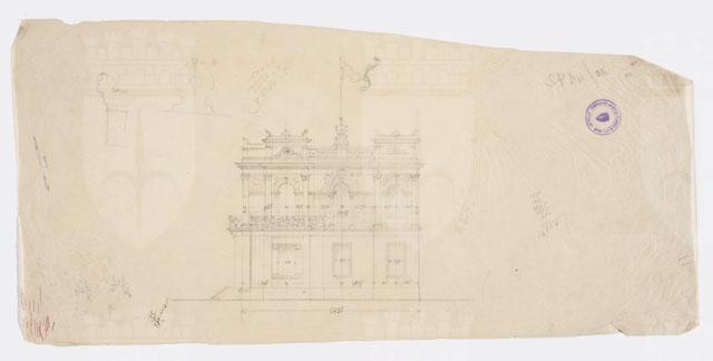La tavola contiene il prospetto laterale, quotato, di una palazzina con due livelli sopra il suolo e due schizzi di dettagli architettonici.