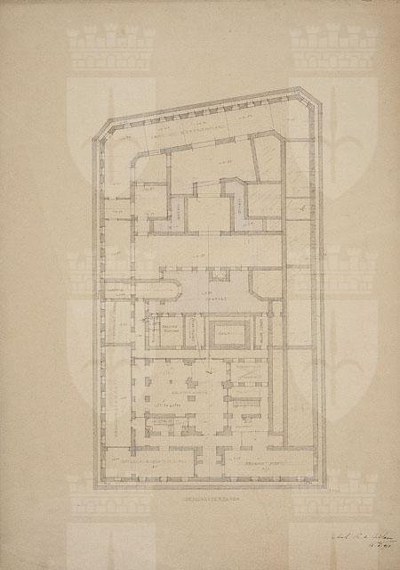 Planimetria del piano semisotterraneo di un edificio, con sezione delle murature tratteggiate. La destinazione dei vani è indicata da iscrizioni. Le zone acquerellate di azzurro corrispondono ai cortili.