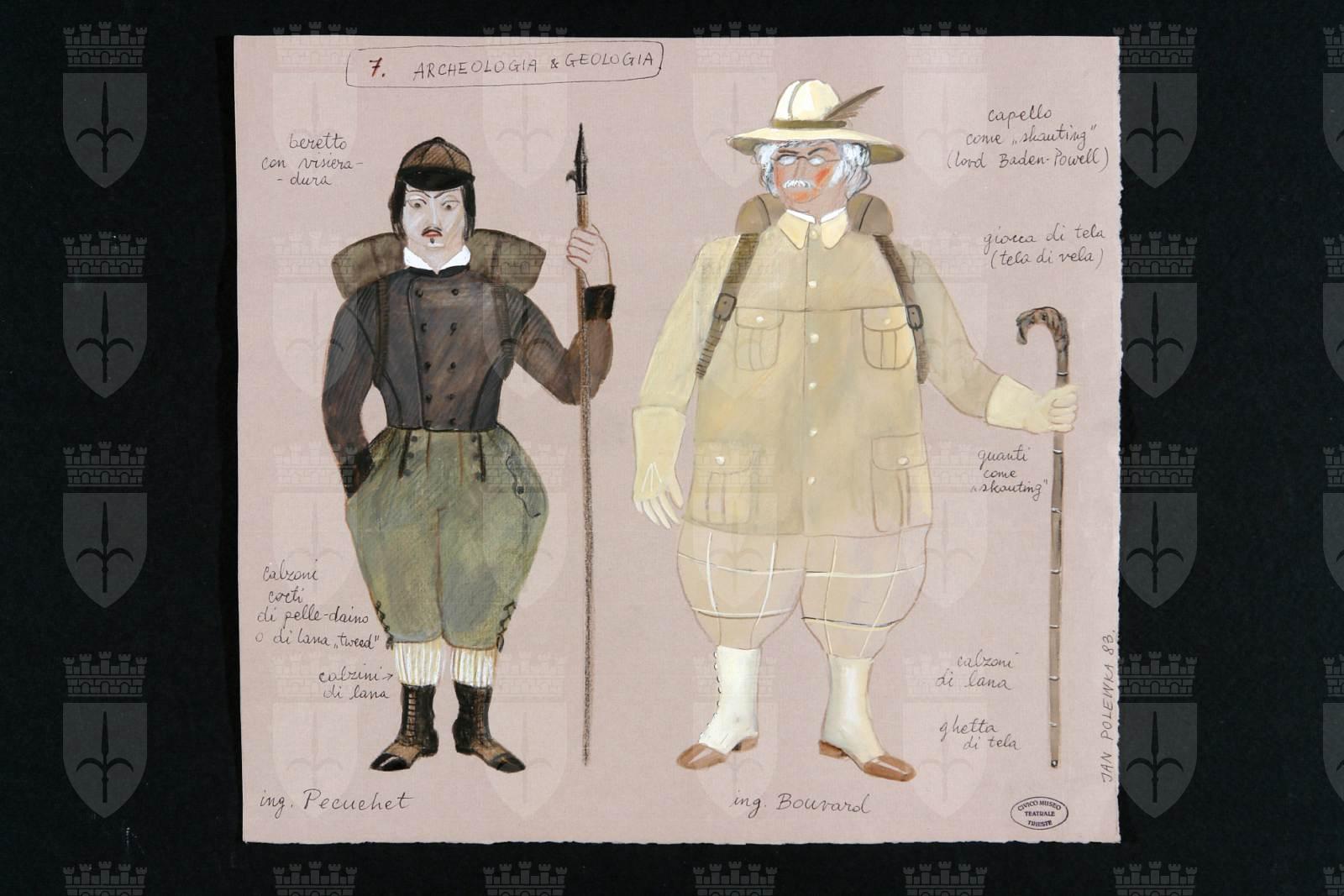 Bouvard e Pecuchet di Tullio Kezich e Luigi Squarzina da Gustave Flaubert. Personaggi: Bouvard e Pecuchet. Due figure maschili intere vestite da geologo e archeologo. La figura di sinistra indossa berretto marrone con visiera, giacchino marrone, zaino, calzone al ginocchio, calzettoni, stivaletti, asta con rampone. La figura di destra indossa: cappello a tesa larga con nastro e piuma ornamentale, giacca a quattro tasche, zaino, pantaloni alla zuava in tessuto a grandi quadri, ghette, bastone in bambù, guanti