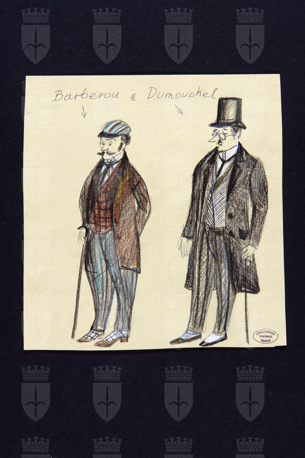 Bouvard e Pecuchet di Tullio Kezich e Luigi Squarzina da Gustave Flaubert. Personaggi: Barberou e Dumouchel. Due figure maschile vestiti da passeggio . A sinistra Barberou: berrettino rigato con frontino, camicia, cravatta, panciotto a riquadri, pantaloni rigati, soprabito, bastone, calze a quadri bicolori, scarpe scollate con tacco basso. A destra Dumouckel: indossa cappello a cilindro, camicia, cravatta, gilè spinato, pantaloni rigati, bastone, ghette bicolori