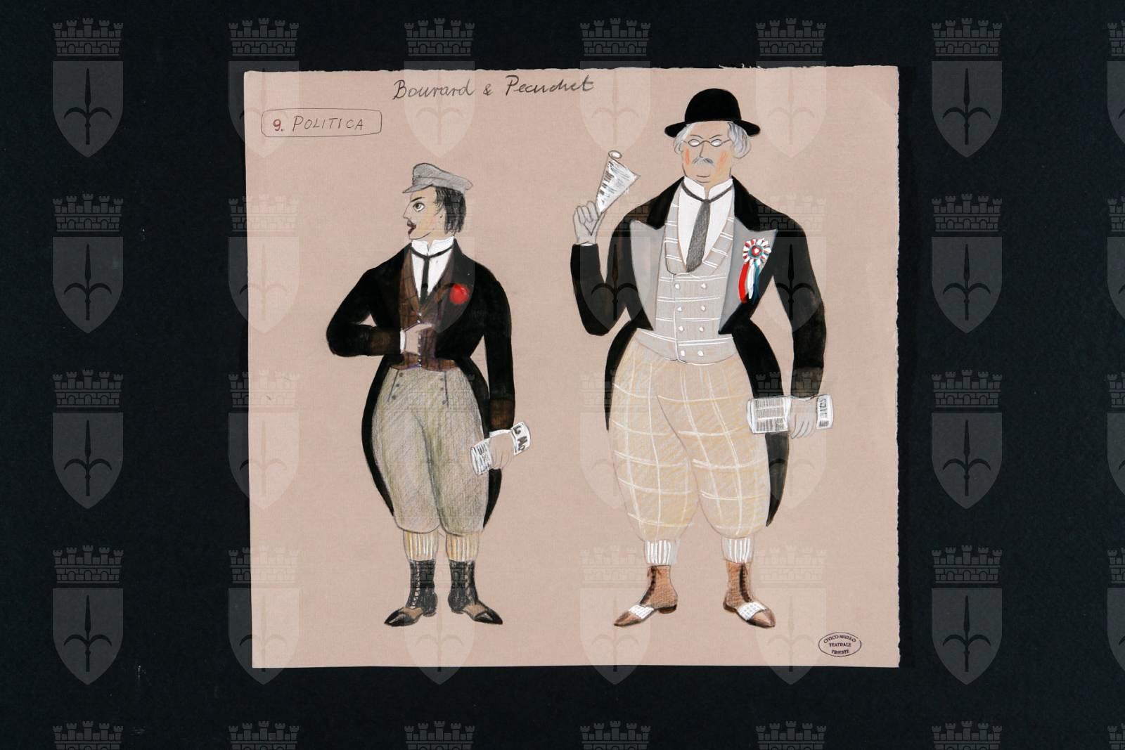 Bouvard e Pecuchet di Tullio Kezich e Luigi Squarzina da Gustave Flaubert. Personaggi: Bouvard e Pecuchet. Due figure maschili intere vestite da politici. la figura di sinistra indossa berretto con frontino, camicia, cravattino, gilè, giacca a coda di rondine, garofano all'occhiello, pantaloni al ginocchio, calzettoni, stivaletti, porta nella mano sinistra un giornale. La figura di destra indossa bombetta nera, camicia, cravatta, coccarda, gilè rigato, giacca a cosa di rondine, coccarda tricolore, pantaloni a quadri al ginocchio, calzettoni, stivaletti bicolore, porta in ciascuna mano un giornale
