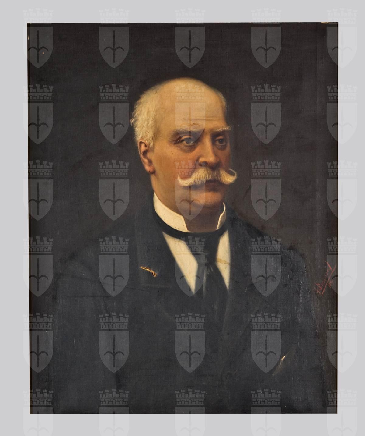 Ritratto di Edoardo Borghi ripreso a mezzobusto di fronte, leggermente ruotato verso destra. Il commerciante viene ritratto in età avanzata, porta capelli e baffi bianchi. Indossa: camicia bianca con colletto alto, cravatta nera al collo, giacca nera abbottonata