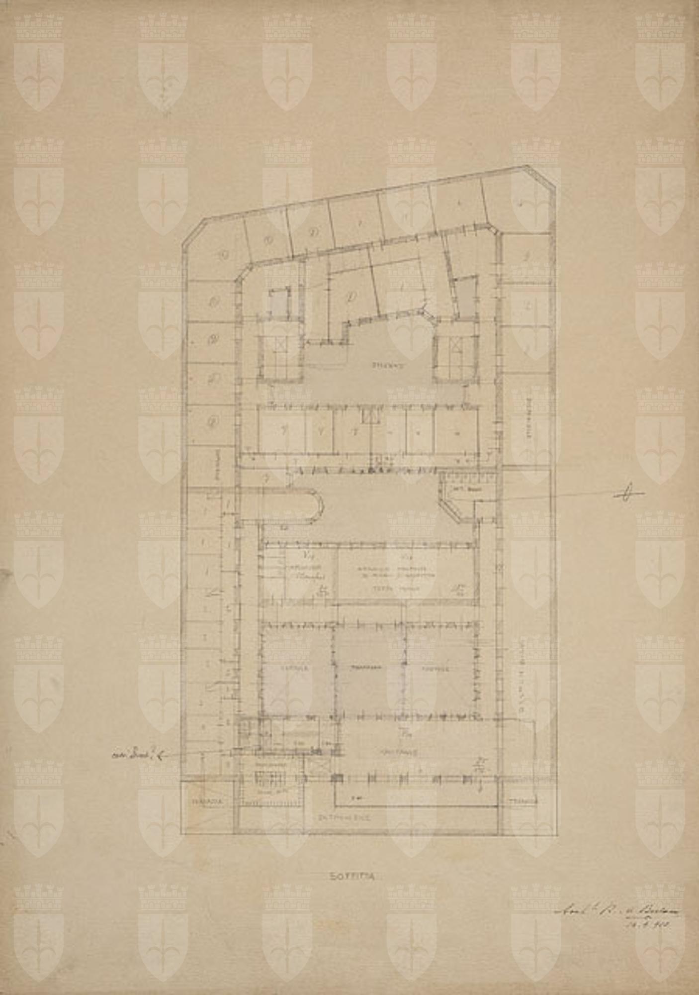 Il disegno in esame appartiene al "Progetto per l'edificio della Riunione Adriatica di Sicurtà", cfr. schede CMSAOAR10_4176-CMSAOAR10_4206. Agli inizi del Novecento il direttore generale della Riunione Adriatica di Sicurtà, Adolfo de Frigyessy, e suo figlio Arnoldo, decisero di realizzare una nuova sede di rappresentanza per la compagnia a Trieste. Acquistato un ampio lotto già edificato tra la piazza Nuova e le vie S. Caterina, S. Antonio e il Corso, e demolite le precedenti costruzioni, indissero nel luglio 1909 un concorso internazionale a inviti per la progettazione di un nuovo palazzo. Oltre a Ruggero e Arduino Berlam, vi parteciparono gli architetti Ignác Alpar, Ludwig Baumann, Max Littmann, Luigi Broggi, Giacomo Zamattio, Giorgio Zaninovich, Enrico Nordio e Ludovico Braidotti. Nel bando si richiedeva che il palazzo contenesse un semi-sotterraneo, un piano elevato, un ammezzato, tre piani superiori più un sottotetto; ma non si davano indicazioni sulla distribuzione interna degli ambienti e su requisiti tecnologici. Nel novembre 1909 la giuria selezionò, tra i progetti pervenuti, quelli di Alpar, Zammattio e dei Berlam (Lettis in Rovello 2007, p. 312) per la seconda fase del concorso. Tuttavia Zammattio e Alpar non si presentarono, cosicché lo studio Berlam, unico rimasto fra i selezionati, ricevette l’incarico. Seguì una fase in cui Ruggero e Arduino Berlam vennero costantemente seguiti dalla committenza nell’elaborazione dell’assetto generale e di ogni minuto dettaglio dell’edificio. La direzione della compagnia assicurativa voleva che lo stabile fosse destinato per metà a sede della società, cioè verso la Piazza Nuova (odierna Piazza della Repubblica); mentre il lato opposto, verso il Corso, fosse adibito a negozi, al pianterreno, e abitazioni. Anche il piano prospiciente la via S. Antonio (attuale via Dante) era riservato agli esercizi commerciali. Il progetto definitivo dei Berlam, datato 2 dicembre 1910, venne approvato dal Magistrato civico il 12 gennaio 1911; il permesso di fabbrica è del 28 giugno 1911. L’Impresa Carlo Bonetti costruì il palazzo, che fu inaugurato il 7 aprile 1914. Si tratta di un capolavoro del tardo eclettismo europeo, in cui si recuperano gli stilemi della tradizione architettonica del tardo Cinquecento. Nel palazzo, articolato in cinque piani, gli architetti si sono rifatti all’architettura “di facciata, ai palazzi italiani del secolo XVI” (Berlam cit. in Lettis in Rovello 2007, p. 313, nota 9). Quanto al disegno in esame, esso illustra la disposizione degli ambienti della soffitta, su cui sono segnate delle modifiche, verosimilmente da apportare nella versione planimetrica definitiva.