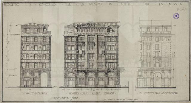 Il disegno in esame appartiene alla serie "Progetto di concorso per un palazzo di affitto per la Riunione Adriatica di Sicurtà, da costruirsi a Trieste in Piazza Oberdan", cfr. schede CMSAOAR10_4207-CMSAOAR10_4218, eseguito da Arduino Berlam. Il 3 febbraio 1934 Arnoldo Frigessi di Rattalma, presidente della Riunione Adriatica di Sicurtà, acquistò l’ultimo lotto disponibile nell’area di piazza Oberdan (pari a 1165 mq) per edificare un palazzo ad uso uffici e abitazioni di alto livello, con l’obbligo di rispettare i vincoli indicati nel piano di sistemazione dell’esedra Oberdan del 1925, per quanto riguardava le facciate e i portici. Lo stesso anno venne indetto un concorso ristretto, cui parteciparono Arduino Berlam, Gustavo Pulitzer-Finali e Umberto Nordio, che risultò vincitore (cfr. Krasovec in Nicoloso, Rovello 2005, pp. 177-179, n. 19).