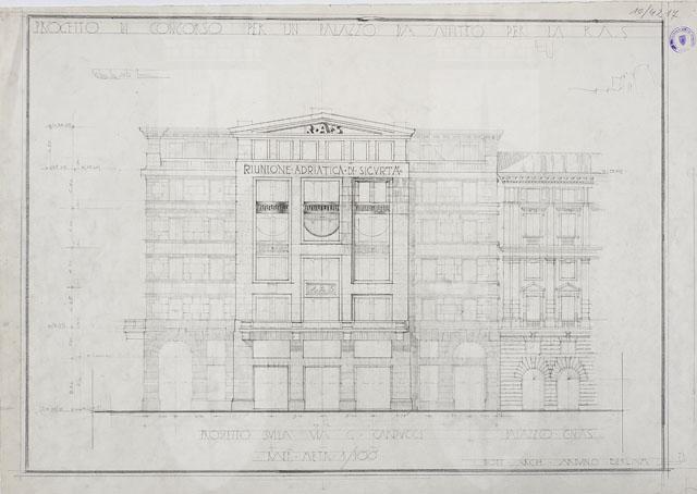 Il disegno in esame appartiene alla serie "Progetto di concorso per un palazzo di affitto per la Riunione Adriatica di Sicurtà, da costruirsi a Trieste in Piazza Oberdan", cfr. schede CMSAOAR10_4207-CMSAOAR10_4218, eseguito da Arduino Berlam. Il 3 febbraio 1934 Arnoldo Frigessi di Rattalma, presidente della Riunione Adriatica di Sicurtà, acquistò l’ultimo lotto disponibile nell’area di piazza Oberdan (pari a 1165 mq) per edificare un palazzo ad uso uffici e abitazioni di alto livello, con l’obbligo di rispettare i vincoli indicati nel piano di sistemazione dell’esedra Oberdan del 1925, per quanto riguardava le facciate e i portici. Lo stesso anno venne indetto un concorso ristretto, cui parteciparono Arduino Berlam, Gustavo Pulitzer-Finali e Umberto Nordio, che risultò vincitore (cfr. Krasovec in Nicoloso, Rovello 2005, pp. 177-179, n. 19).