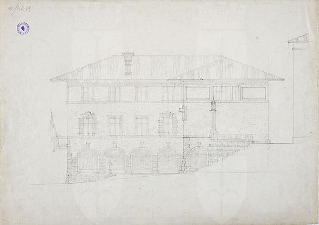 Disegno a matita; progetto per la facciata laterale di un edificio ad L, impostato su piano leggermente in pendenza. Consta di due piani elevati e di uno leggermente rialzato, che è definito da un portico con aperture ad arco.