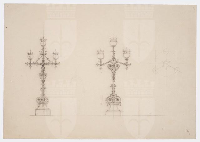 Il foglio presenta due studi per lampade a candelabro, diverse nella struttura, e un disegno geometrico incompleto.