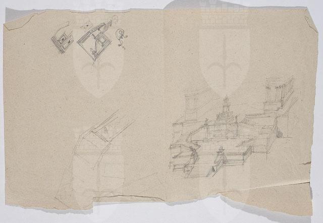 Schizzo del monumento in onore di Vittorio Emanuele II. Sul recto, abbozzo generale del monumento e dettagli architettonici; sul verso, studio per la statua equestre e il suo basamento.