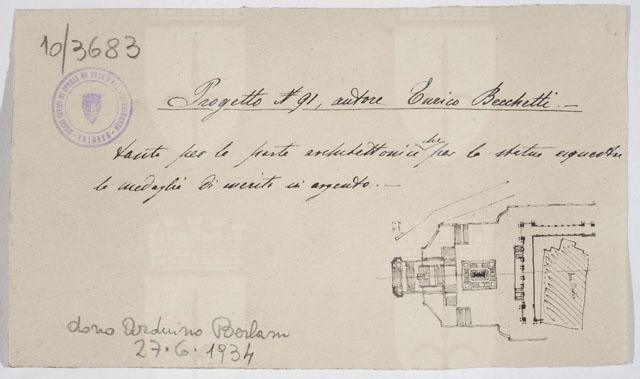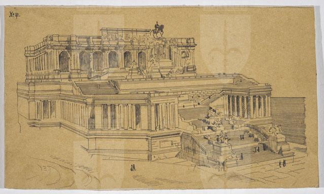 Il disegno è annesso alla serie di studi per il Monumento nazionale a Vittorio Emanuele II, cfr. schede CMSAOAR10_3646-CMSAOAR10_3688, eseguiti da Ruggero Berlam. Egli partecipò al secondo concorso per il monumento a Vittorio Emanuele II a Roma, indetto dal momento che la prima selezione, svoltasi nel 1880, non ebbe un vincitore. Nel primo bando l’unico vincolo posto ai progettisti era stato quello del costo; il secondo, pubblicato il 18 dicembre 1882, prevedeva di collocare il monumento sul colle Capitolino e ne fissava alcune caratteristiche: un fondale architettonico e una statua di Vittorio Emanuele II, dapprima seduto su un trono, poi a cavallo. Secondo Sticotti, Berlam inviò il progetto in incognito da Milano, per non essere riconosciuto come austriaco; ma dopo esser stato esposto a Roma, esso fu fatto sparire, su volontà del primo ministro Agostino Depretis, per non turbare i rapporti che si erano creati con l’Austria. Il concorso, cui parteciparono 98 progettisti, fu vinto da Giuseppe Sacconi, con un progetto che presenta affinità con quello di Ruggero Berlam; secondo classificato Manfredo Manfredi, terzo Bruno Schmitz. In seguito, vi fu un terzo bando ristretto ai primi tre classificati, vinto da Sacconi. Quanto al disegno in esame, si tratta di una copia del progetto N. 91 presentato da Enrico Becchetti che ricevette una medaglia di merito in argento per la parte archiettonica e la statua equestre.