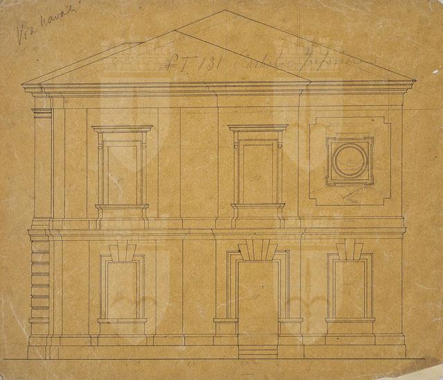 Disegno preparatorio. L'appunto "via Navali" suggerisce si tratti dello studio per un prospetto di uno dei villini realizzati da Ruggero Berlam nella zona di San Vito a Trieste. Confrontando il disegno in esame con il progetto pubblicato da Pozzetto (1999, p. 98, fig. 172), si propone di riconoscervi uno studio per una facciata laterale della casa di campagna eretta su una frazione dell'area Chiarbola inferiore n. 131, corrispondente a via Navali n. 12, per gli eredi di Andrea Ganzoni e di Tommaso Livesey. Presso l'Archivio Generale del Comune di Trieste (Archivio Pianificazione Urbana, ser. disegni 5308/0) si conserva il progetto, completo di prospetto principale, sezione e planimetria, presentato al Magistrato Civico cittadino, che lo approvò nel 1881; data che può esser estesa anche al disegno dei Civici Musei di Storia ed Arte.