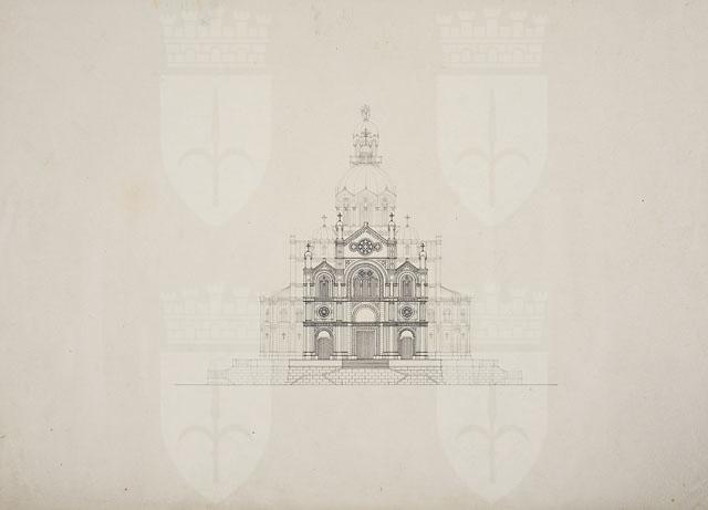 Si tratta di uno dei disegni del "Progetto di chiesa di tipo romanico con pianta a croce latina, con campanile posteriore" (cfr. CMSAOAR10_4129 - CMSAOAR10_4134), pervenuti nel 1953 nelle collezioni dei Civici Musei di Storia ed Arte attraverso l’acquisto Lituano Samero.