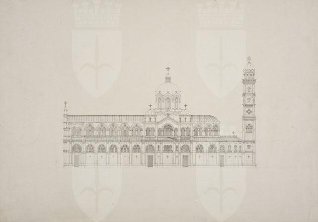 Si tratta di uno dei disegni del "Progetto di chiesa di tipo romanico con pianta a croce latina, con campanile posteriore" (cfr. CMSAOAR10_4129 - CMSAOAR10_4134), pervenuti nel 1953 nelle collezioni dei Civici Musei di Storia ed Arte attraverso l’acquisto Lituano Samero.