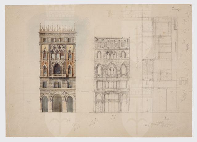 Tavola dedicata alla progettazione di un edificio in stile gotico-veneziano. Presenta uno schizzo della facciata e della sua planimetria, rispettivamente al centro e a destra. A sinistra, una rielaborazione più dettagliata della facciata, eseguita ad acquerello.