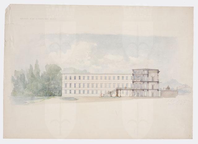 Disegno a matita e acquerello policromo, raffigurante la sezione trasversale di un ospedale entro parco. Grande terrazza al primo livello sul retro del corpo principale.
