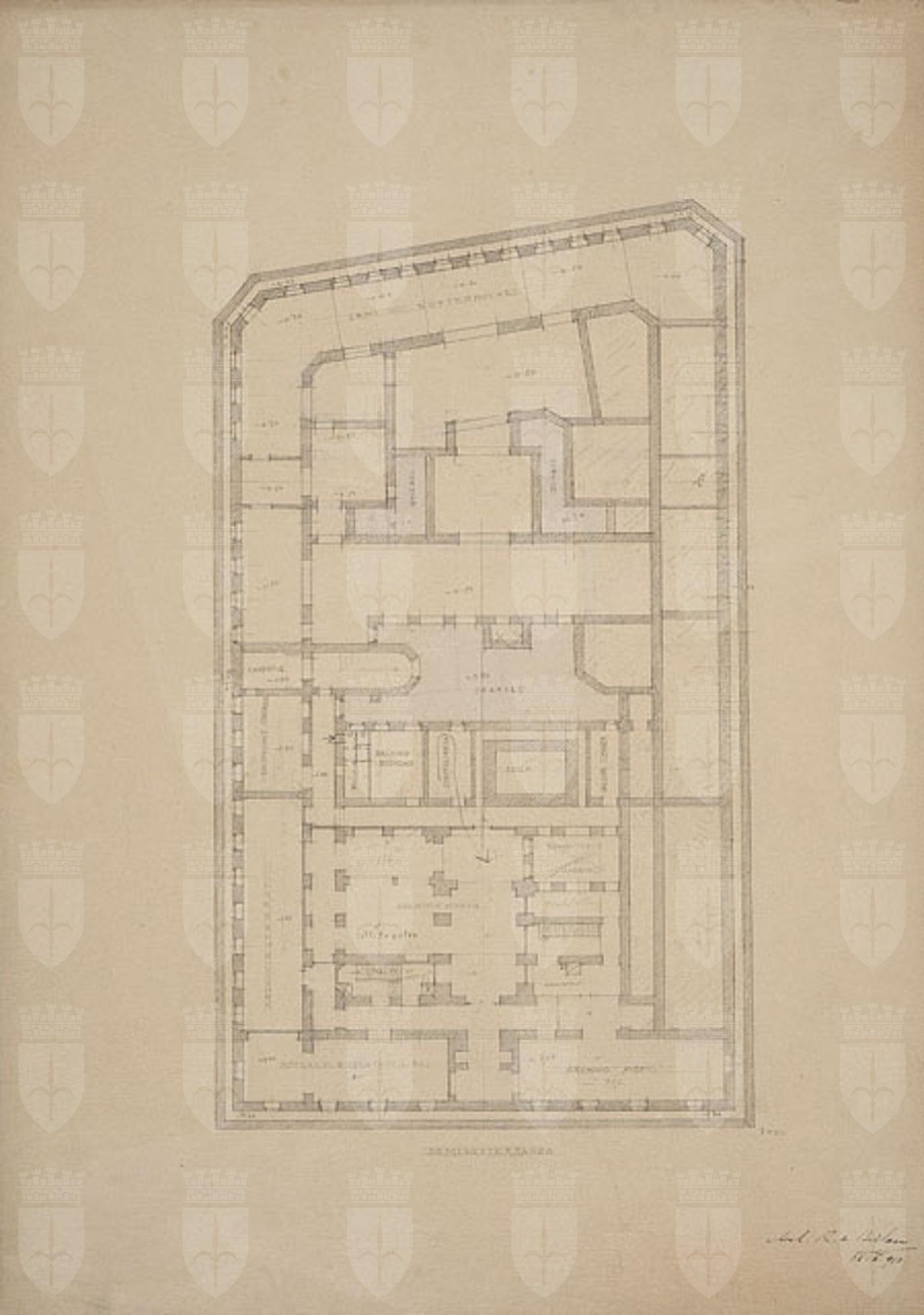 Planimetria del piano semisotterraneo di un edificio, con sezione delle murature tratteggiate. La destinazione dei vani è indicata da iscrizioni. Le zone acquerellate di azzurro corrispondono ai cortili.