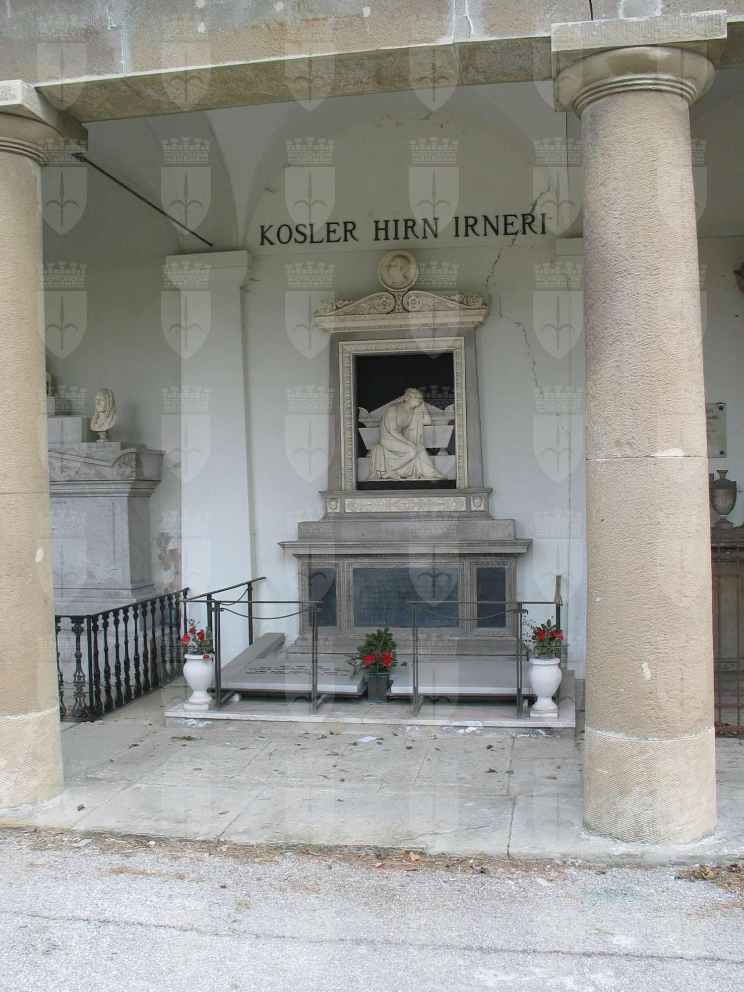 La tomba è stata concessa il 16.07.1842 a Maria Hirn vedova Kosler (Archivio Acegas APS). Il dedicatario, Ugo Irneri (Trieste 1896-1979), fu assicuratore, fondatore del Lloyd Adriatico. Ricordato nella toponomastica cittadina.