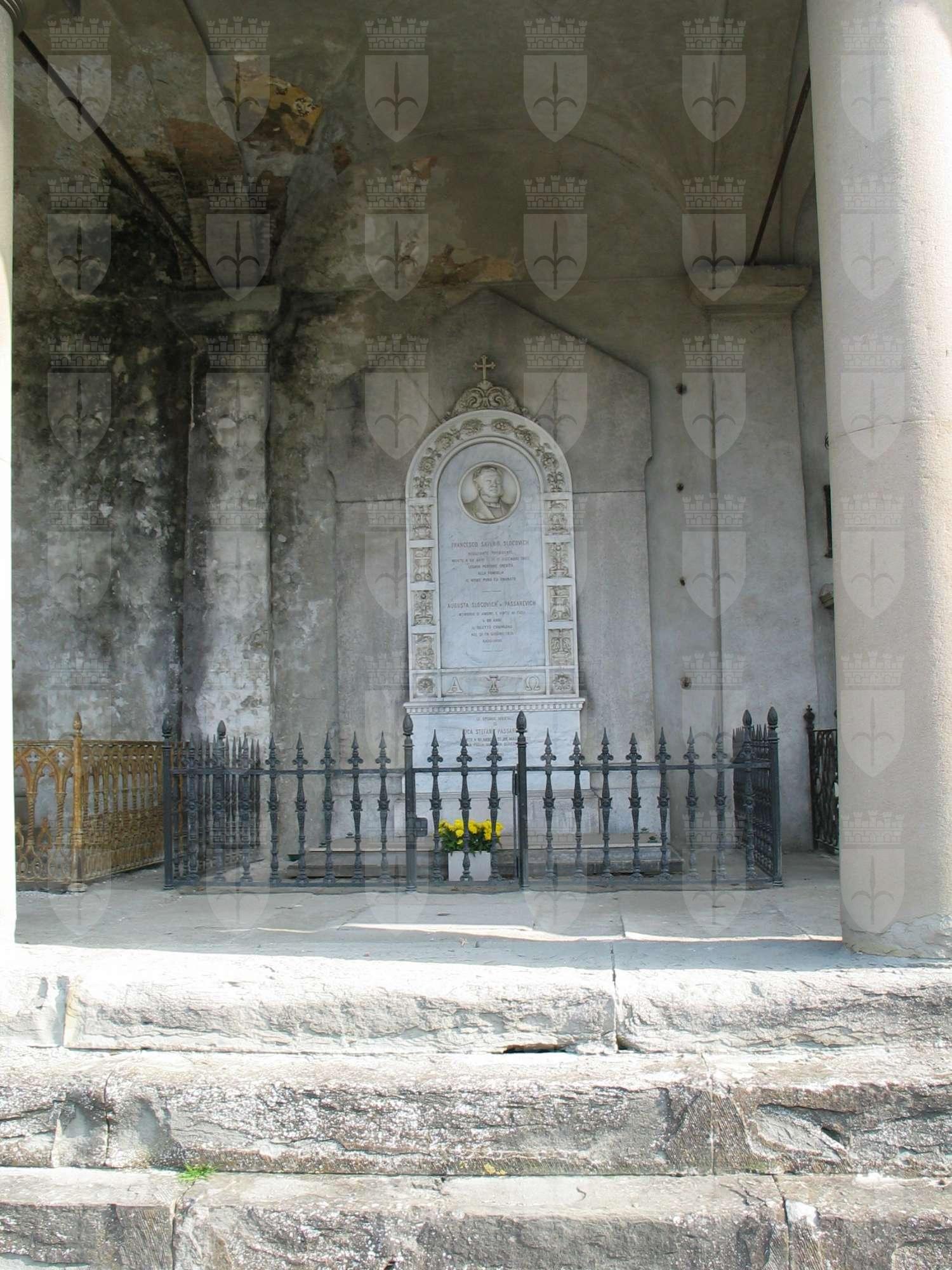 La tomba è stata concessa il 02.04.1864 ad Augusta Passarevich Slocovich (Archivio Acegas APS). Il dedicatario Francesco Saverio Slocovich (1794-1862) fu un facoltoso negoziante triestino.