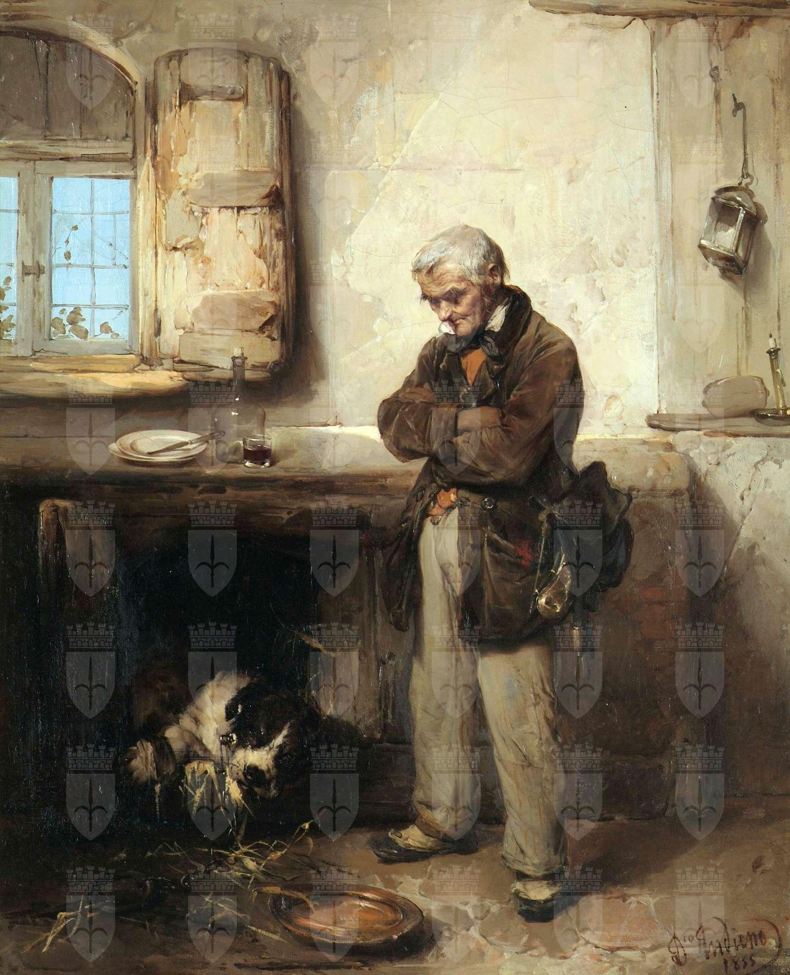 Un'altra figura di vecchio, un altro personaggio che ritorna dopo esser già comparso in un dipinto di poco precedente, ovvero in Il cacciatore (o Il racconto del cacciatore), esposto a Brera nel 1854, acquistato dalla medesima Accademia, tuttora nelle collezioni della Pinacoteca. E in effetti i cataloghi del Museo risalenti agli anni venti citano un Cacciatore di Domenico Induno, che sicuramente fa riferimento a questo dipinto. Lo stesso personaggio che qui accudisce al suo cane mentre sta mangiando, nel dipinto di Brera è seduto con il fucile nella mano sinistra, appoggiato a terra, e un bicchiere di vino rosso nella destra; si volge verso la bambina, arrampicata, in ginocchio sulla sedia di fronte a lui, pronta ad ascoltare le sue imprese di caccia. E del resto anche il vecchio del dipinto del Revoltella pare avere un fucile sulla sua spalla, accanto alla borraccia posata sul fianco, e dunque potrebbe in effetti essere il medesimo personaggio accanto al suo fedele compagno di caccia. Ricompare anche lo stesso bicchiere di vino rosso, accanto alla bottiglia trasparente e i piatti vicino alla finestra. Il segno più sottile, il soffermarsi del pennello su alcuni oggetti, accomuna questo dipinto agli altri dell'Induno di questo periodo.