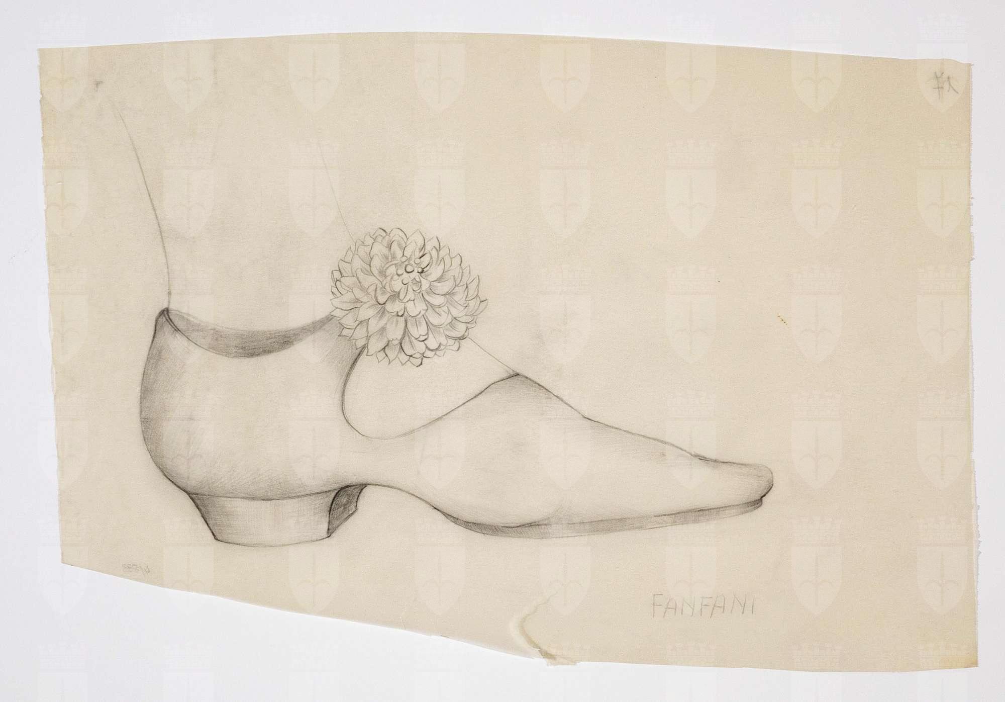 Il gioco dei potenti, libero adattamento di Giorgio Strehler da Enrico VI, dramma storico di William Shakespeare, in 15 atti e 2 giornate. Calzatura con tacco basso con pon-pon floreale, di profilo verso destra.