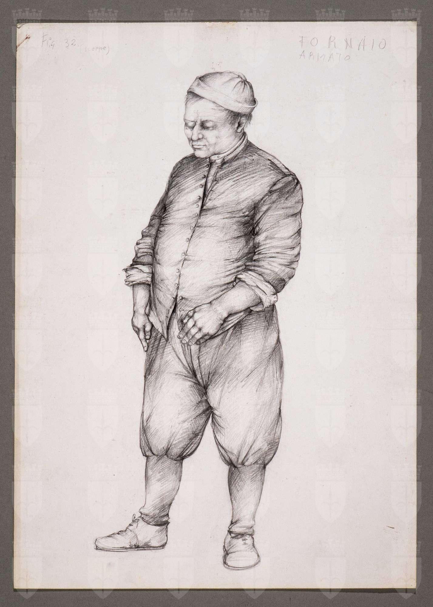 Il gioco dei potenti, libero adattamento di Giorgio Strehler da Enrico VI, dramma storico di William Shakespeare, in 15 atti e 2 giornate. Figura maschile in piedi, di tre quarti verso sinistra, con lo sguardo rivolto a terra. Indossa un piccolo copricapo con risvolto, una casacca con le maniche rimboccate, brache alte al ginocchio, calze grosse.