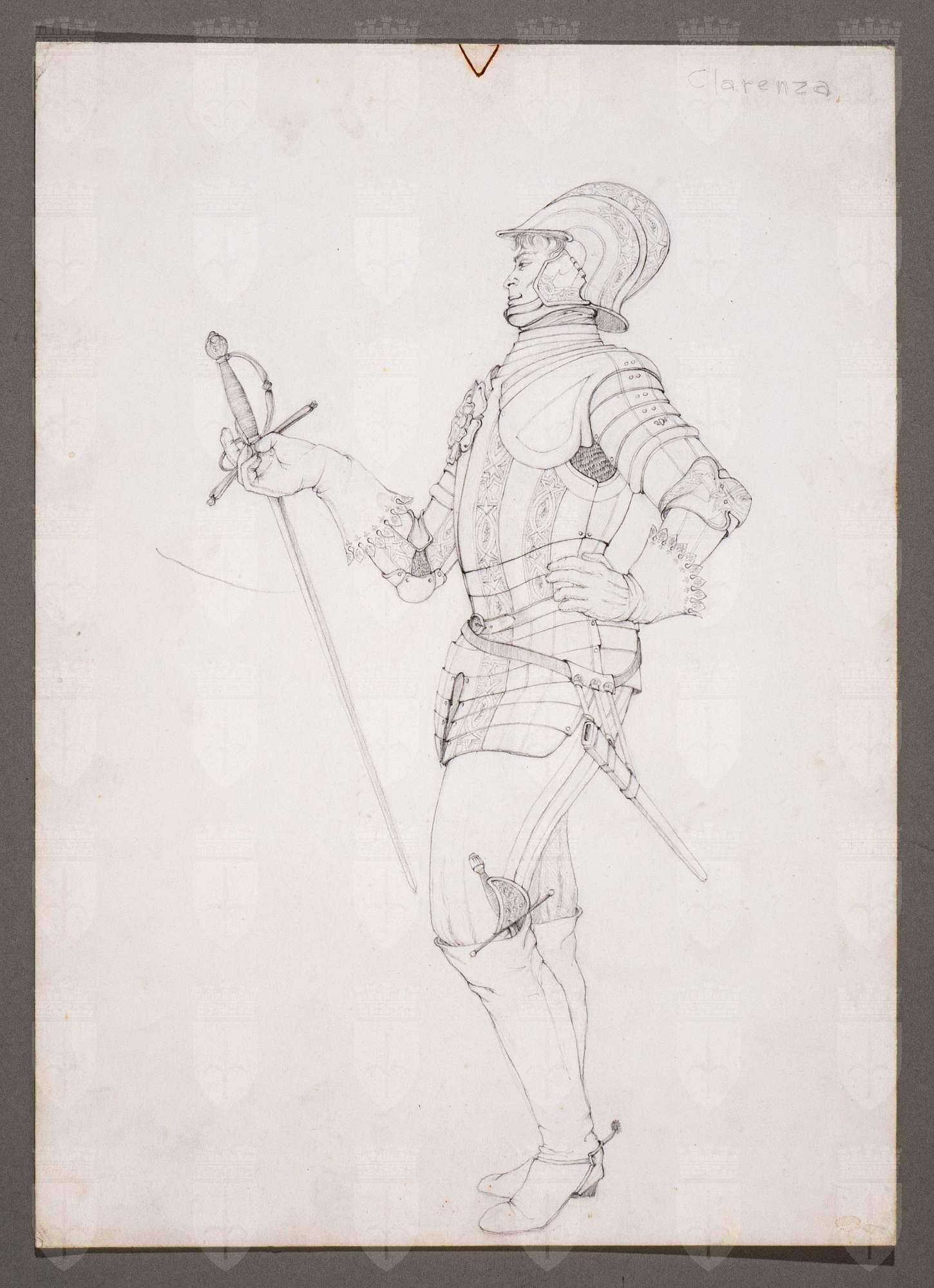 Il gioco dei potenti, libero adattamento di Giorgio Strehler da Enrico VI, dramma storico di William Shakespeare, in 15 atti e 2 giornate. Figura maschile in piedi, di profilo verso sinistra, ritratta dal basso. Indossa una corazza completata da un elmo sul capo, guanti lunghi riccamente decorati sul bordo, calzamaglia e stivali con speroni. Dalla vita pende il fodero della spada che la figura regge mollemente con la sua mano destra. L'elsa di un'altra arma sporge dal suo stivale sinistro.