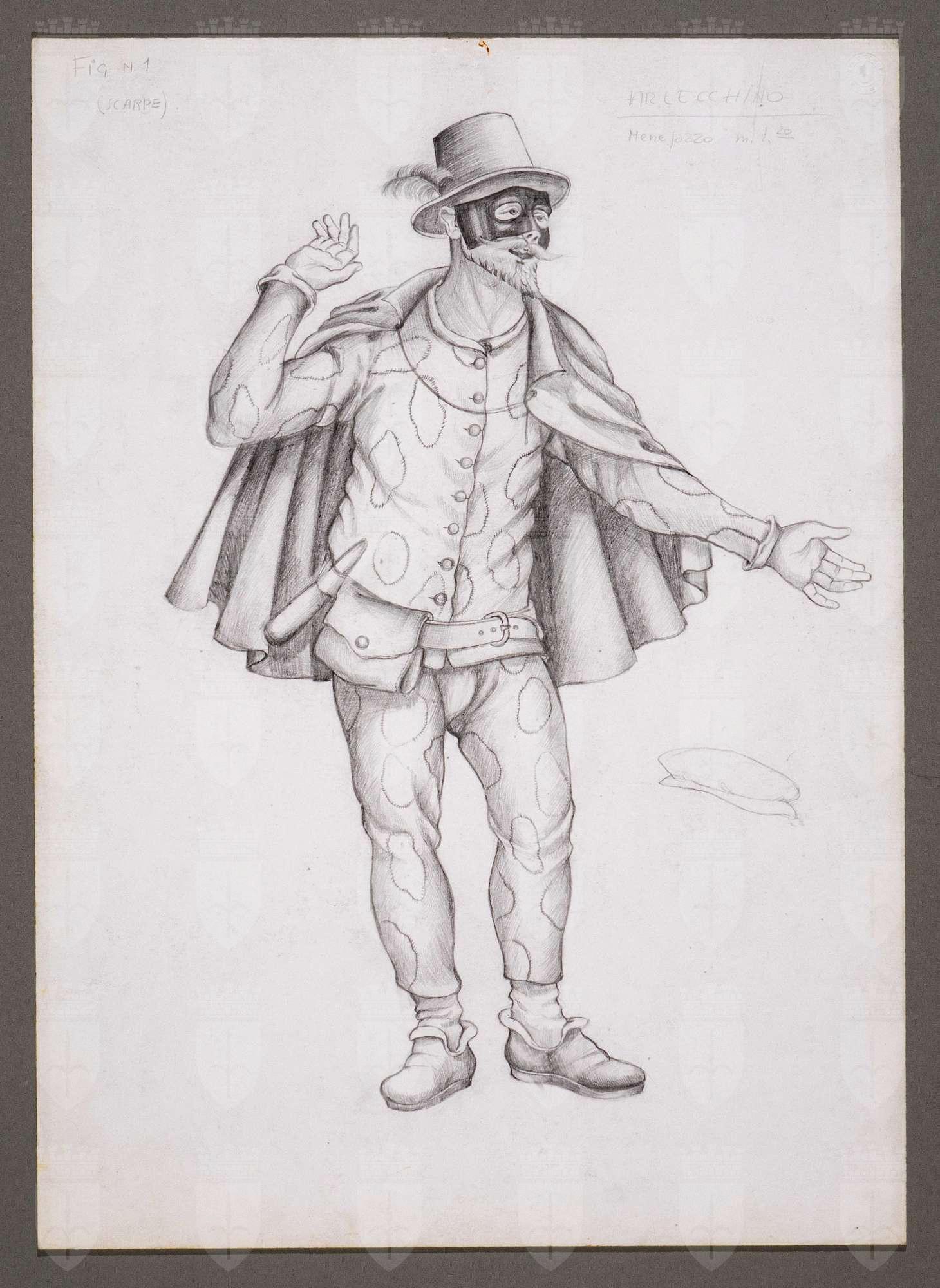 Il gioco dei potenti, libero adattamento di Giorgio Strehler da Enrico VI, dramma storico di William Shakespeare, in 15 atti e 2 giornate. Figura maschile in piedi, leggermente di tre quarti verso destra in costume di Arlecchino. Indossa un cappello a cilindro piumato, un abito a pezze tondeggianti irregolari formato da casacca e calzoni, un mantello corto. La parte alta del viso sopra i baffi e la barba a punta è coperta da una maschera. In vita porta una cintura alla quale sono infilati un manganello e una piccola borsa. Schizzo di un secondo cappello a destra della figura, al centro.