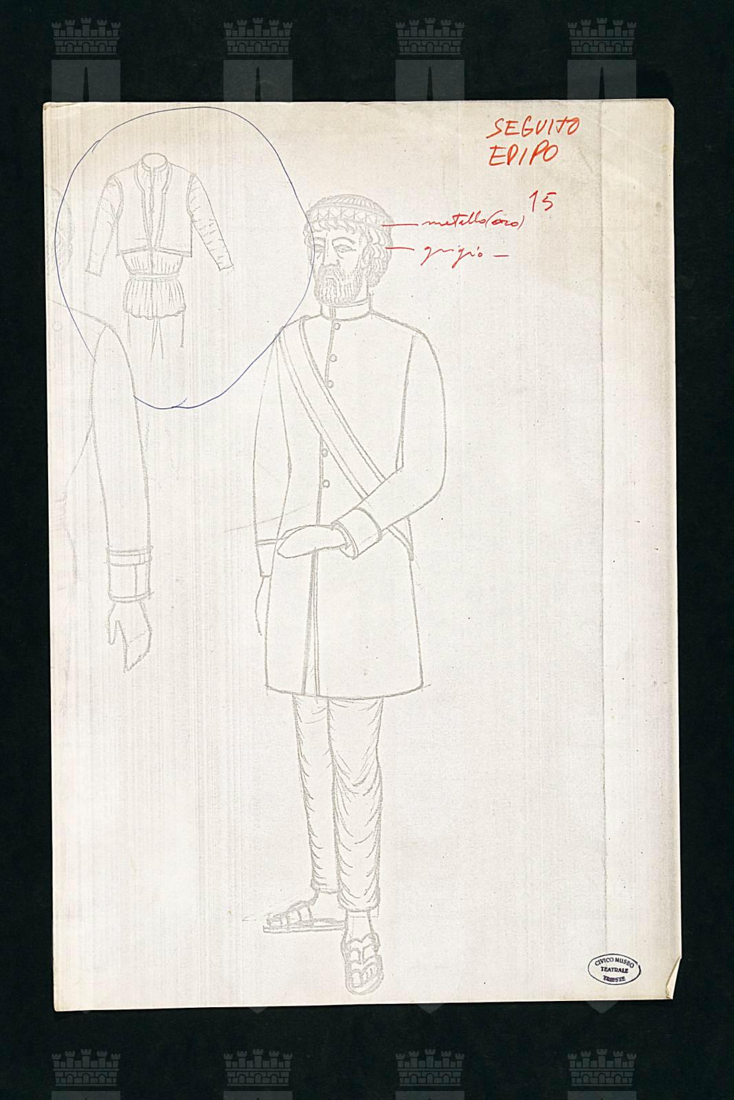 Edipo Re di Sofocle, figura maschile intera, indossa una calotta rigida con fascia frontale a decori geometrici; abito a manica lunga con risvolti ai polsi, colletto circolare rigido, abbottonatura centrale, fascia, pantaloni alla caviglia, sandali. In alto piccolo disegno con casacca e giacchino, altra sezione laterale lungo il bordo