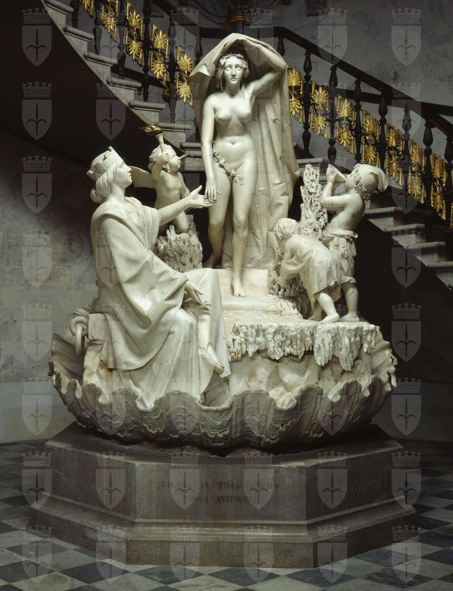Il monumentale gruppo allegorico della Ninfa Aurisina fu terminato nell’aprile del 1858 a Milano, dove rimase esposto per un mese nello studio dell’artista, «costituendo un polo d’attrattiva nella vita cittadina di quel momento sempre attenta al nascere di opere degne di ammirazione e che potessero dar lustro alla città lombarda» (Tamburini 1984). Non stupisce che Pasquale Revoltella, allora impegnato nell’edificazione della sua dimora, per la quale si avvalse di artisti e di artigiani della più varia provenienza, avesse guardato con interesse al Lombardo-Veneto, individuando, come il più adeguato alle sue esigenze di rappresentanza e prestigio personale, lo scultore Pietro Magni. Ritenuto tra i protagonisti della Scuola di Milano e divenuto celebre con "La leggitrice", presentata a Brera nel 1856, Pietro Magni realizzò la “fontana della Nabresina” in occasione dell’attivazione del nuovo acquedotto di Trieste, che subentrava a quello Teresiano (attivo dal 1751), ormai insufficiente alle esigenze della città ottocentesca, particolarmente estesa e popolata. Revoltella partecipò finanziariamente all’impresa, per la quale si era costituita nel 1855 una Società per l’acquedotto di Aurisina, presieduta da Carl Ludwig von Bruck, amico e socio di Revoltella in diverse iniziative commerciali. Pertanto ne fu a tal punto orgoglioso che volle ricordare l’evento mediante una prestigiosa opera d’arte, che fu collocata all’entrata della sua ricca dimora dal 26 giugno del 1858 e che ancora oggi è motivo di forte attrazione e stupore per i visitatori del Museo. Il gruppo allegorico, più volte descritto e commentato negli anni (Gatta, Rovani e, localmente, Formiggini, Kandler, Revoltella, Scrinzi in "Tre giorni a Trieste", 1858), è costituito dalle personificazioni della sorgente (la Ninfa Aurisina) e della città di Trieste, elegantemente adagiata sulle rive del mare, da un genietto alato con la torcia, che affianca la Ninfa all’uscita dalle rocce, e da due fanciulli colti nell’atto di abbeverarsi, che rappresentano il popolo e il ceto marinaro. L’opera rese celebre Revoltella ben oltre i confini cittadini, procurandogli notevoli consensi soprattutto nell’ambiente artistico milanese, al punto che nel 1858 venne a lui indirizzato il tradizionale Album dell’Esposizione di Belle Arti dell’editore Canadelli, con una lusinghiera dedica introduttiva.