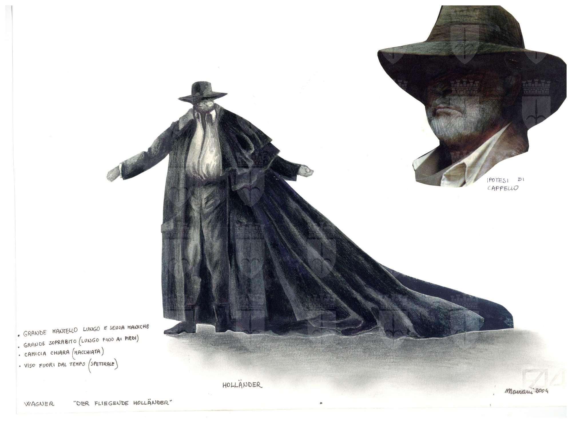Der fliegende Holländer di Richard Wagner. Personaggio: Holländer. Indossa un cappello a larga tesa che copre mezzo volto, camicia ampia bianca, pantalone scuro lungo tipo jeans scuro, un largo soprabito grigio scuro, sul lato sinistro un lungo mantello nero aperto davanti a balze e con strascico