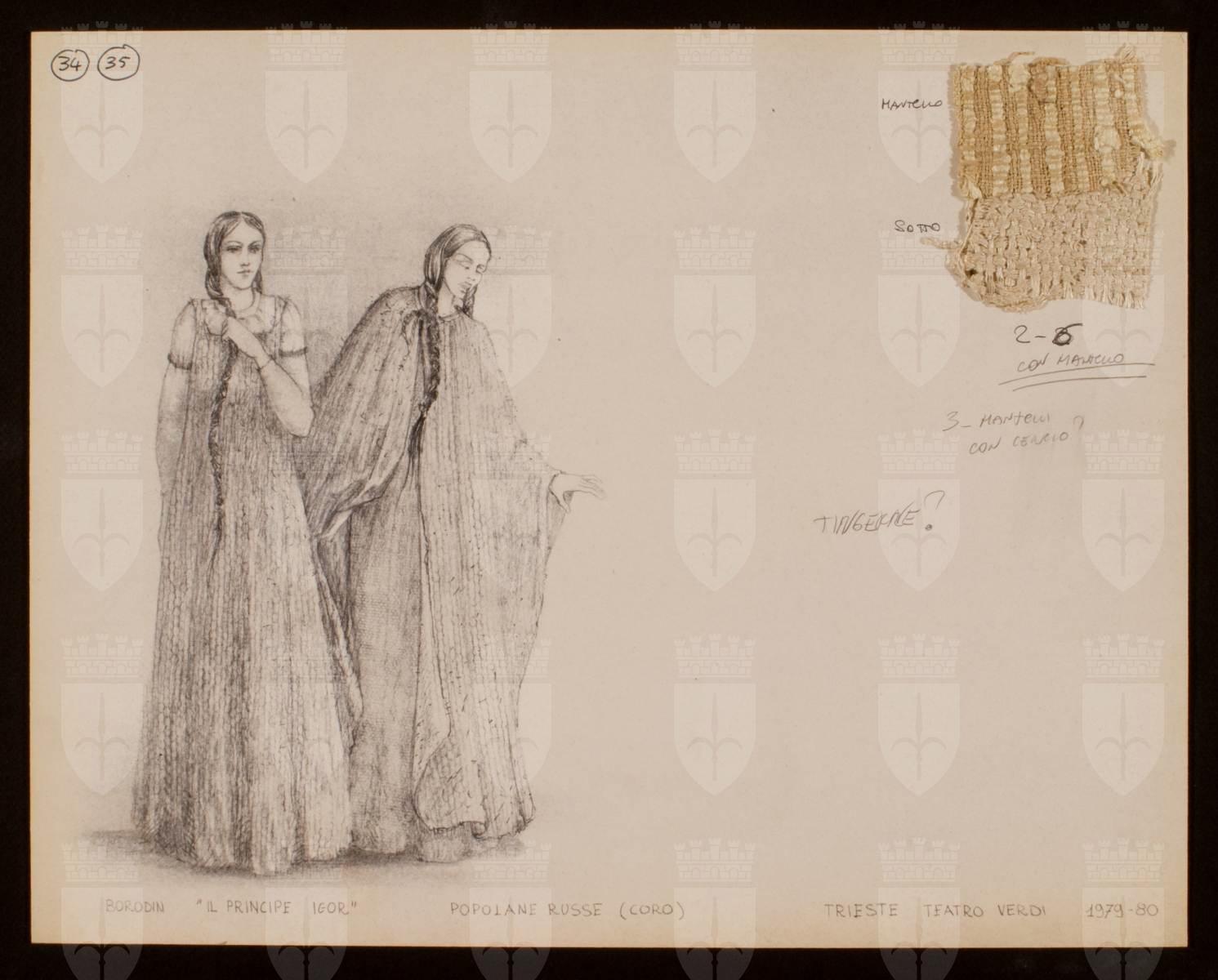 Il principe Igor, opera di Aleksandr Porfir'evič Borodin. Costume per due popolane russe. Due figure femminile intere, entrambe portano una lunga treccia. La figura di destra indossa un abito con mantello fatto di tessuto grezzo a trama larga. La figura di sinistra indossa un abito dritto senza maniche di tessuto grezzo a trama larga sovrapposto a blusa.