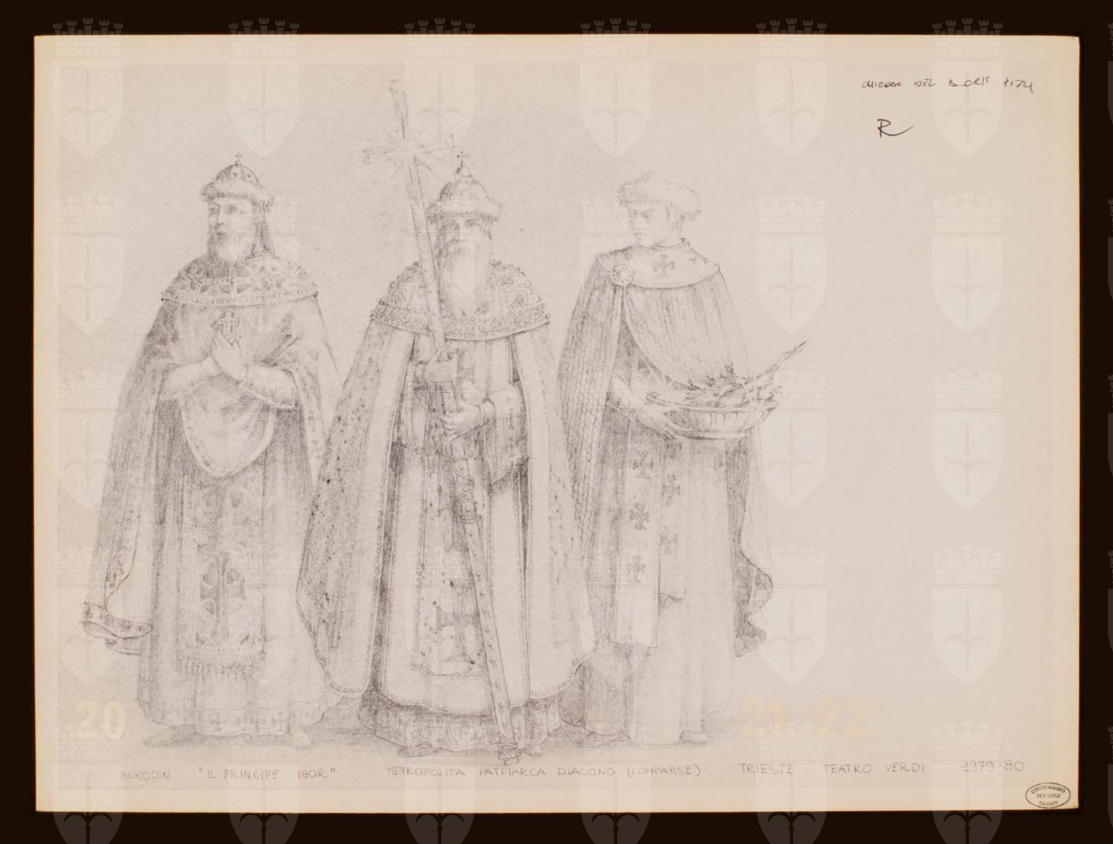 Il principe Igor, opera di Aleksandr Porfir'evič Borodin. Tre costumi per metropolita, patriarca, diacono ortodossi, tre figure del clero maschili intere. Figura di destra: copricapo bordato di pelliccia, abito, manto, stola a croci quadrate, regge in mano un'acquasantiera con ramoscello. La figura al centro e a sinistra: indossano come copricapo zuccotti a spicchi con croci romane ai vertici e bordi di pelliccia, abiti e mantello cerimoniale con pannelli crociati. La figura al centro reca in mano una grande croce processuale