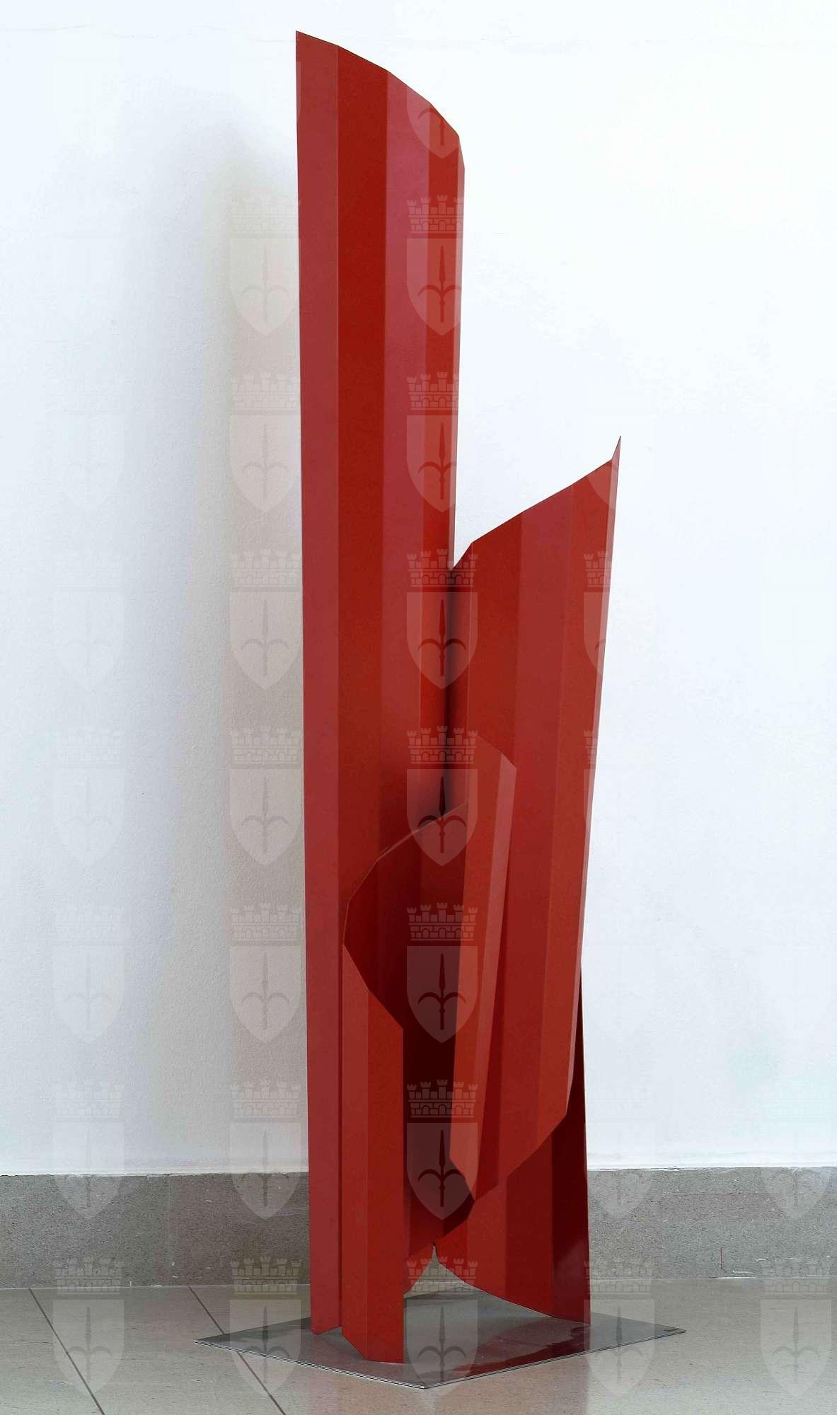 Dopo l’ultima fase, informale, della sua pittura, Perizi inizia una produzione scultorea che annovera una notevole quantità di “Strutture”. Il termine stesso spiega lo scopo delle opere: strutturare lo spazio con linee (spigoli) e piani (diedri). Si tratta di sculture “leggere”, che hanno un volume virtuale creato dall’incontro dei piani, non formano una figura geometrica solida ma una struttura non conclusa che dialoga con lo spazio. L’opera in esame è caratteristica di questa produzione: una scultura in ferro, geometrizzante, del tutto aniconica e rigorosamente monocroma, verniciata in modo uniforme con il colore puro, rosso in questo caso, oppure azzurro o bianco in altri. Le lamine sono ripiegate ma hanno forme aperte che si dispiegano come ali geometriche e stilizzate, si aprono come ventagli o come nell’opera in questione si articolano in verticale, sottili e armoniose. Lo stesso artista documenta il suo operato. «Nel 1970 ebbe termine il mio lungo viaggio attraverso la pittura [scrive l’artista]. La tela bianca, asettica, astratta era percorsa e divisa da linee che ne commisuravano gli spazi. I segni definivano piani apparenti che si compenetravano promuovendo intricati ritmi di profili acuti o spezzati, guidati da una specie di fremente geometria descrittiva. Ebbi allora un’intuizione: il “Campo” convenzionale del quadro diventa il soggetto plastico, la tela si trasforma in superficie di ferro o acciaio, che si flette, si spezza; i piani così ottenuti con gli spigoli taglienti formano diedri che invadono lo spazio reale e con esso interagiscono. Si creano delle quinte, dei piani articolati che mantengono proprietà virtuali, perché lo spazio, or dentro or fuori, non è mai racchiuso, non forma volume». Tra le opere dell’artista presenti nelle collezioni museali si ricorda anche "Struttura in acciaio" della fine degli anni Settanta.