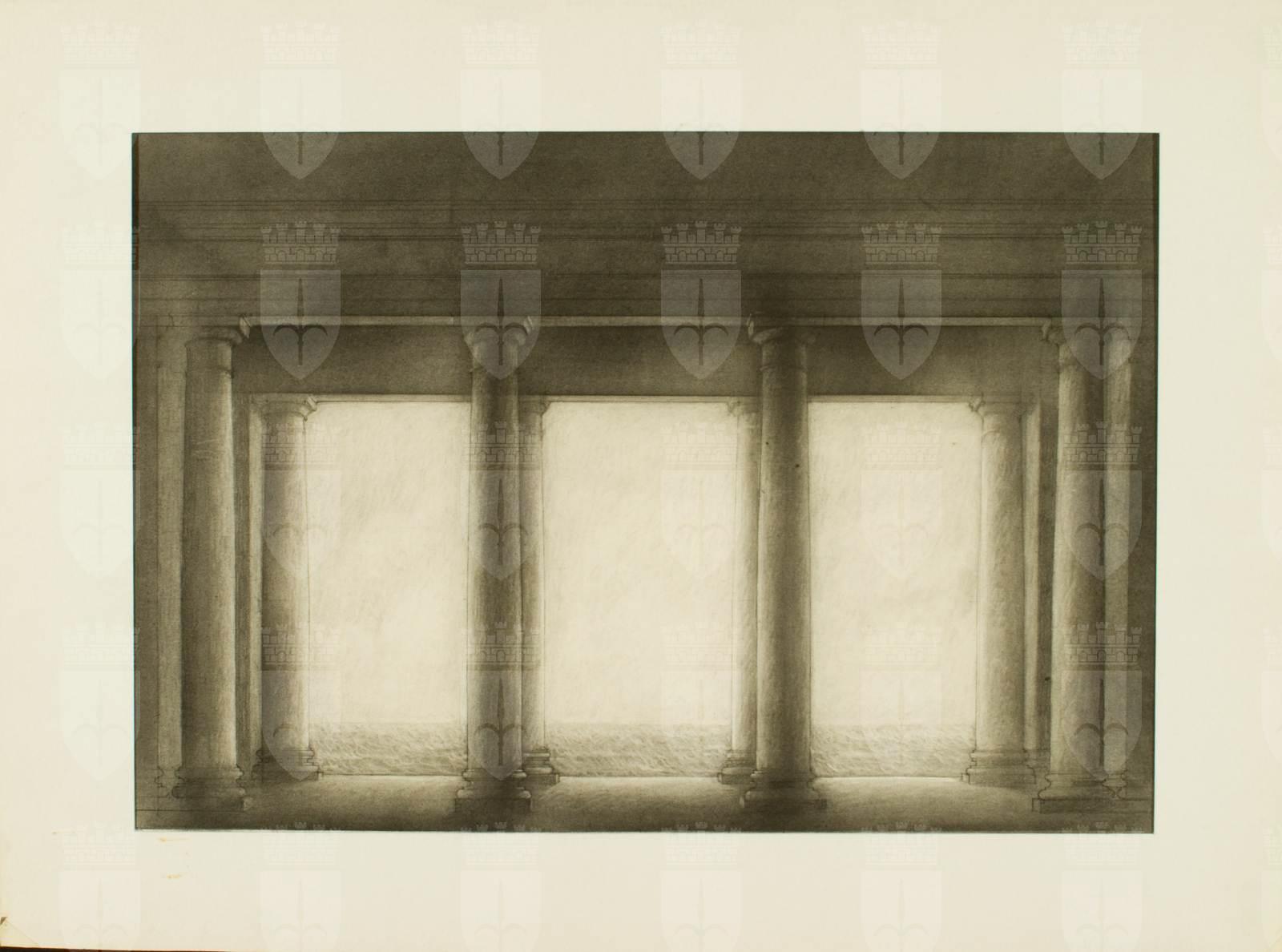 Otello, opera di Giuseppe Verdi, atto 2., castello. Interno con sala con 8 colonne di ordine toscano e trabeazione