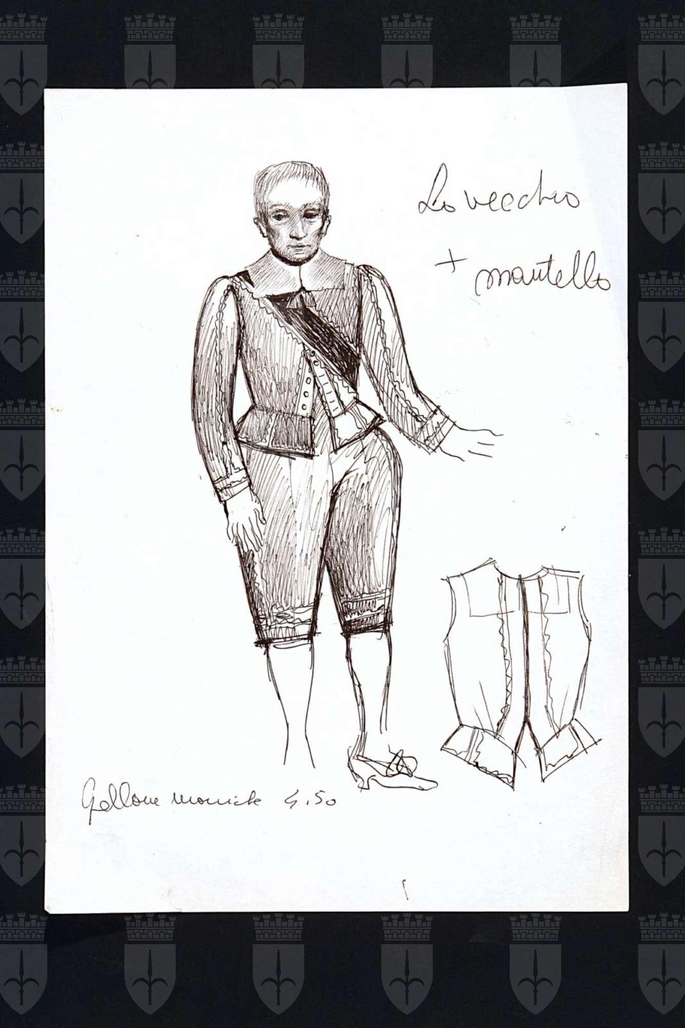 Come vi piace, commedia pastorale di William Shakespeare. Figura maschile intera, di fronte, in abito cinquecentesco, brache e giubba con una fascia a tracolla. Sulla destra schizzo del sotto giacca.