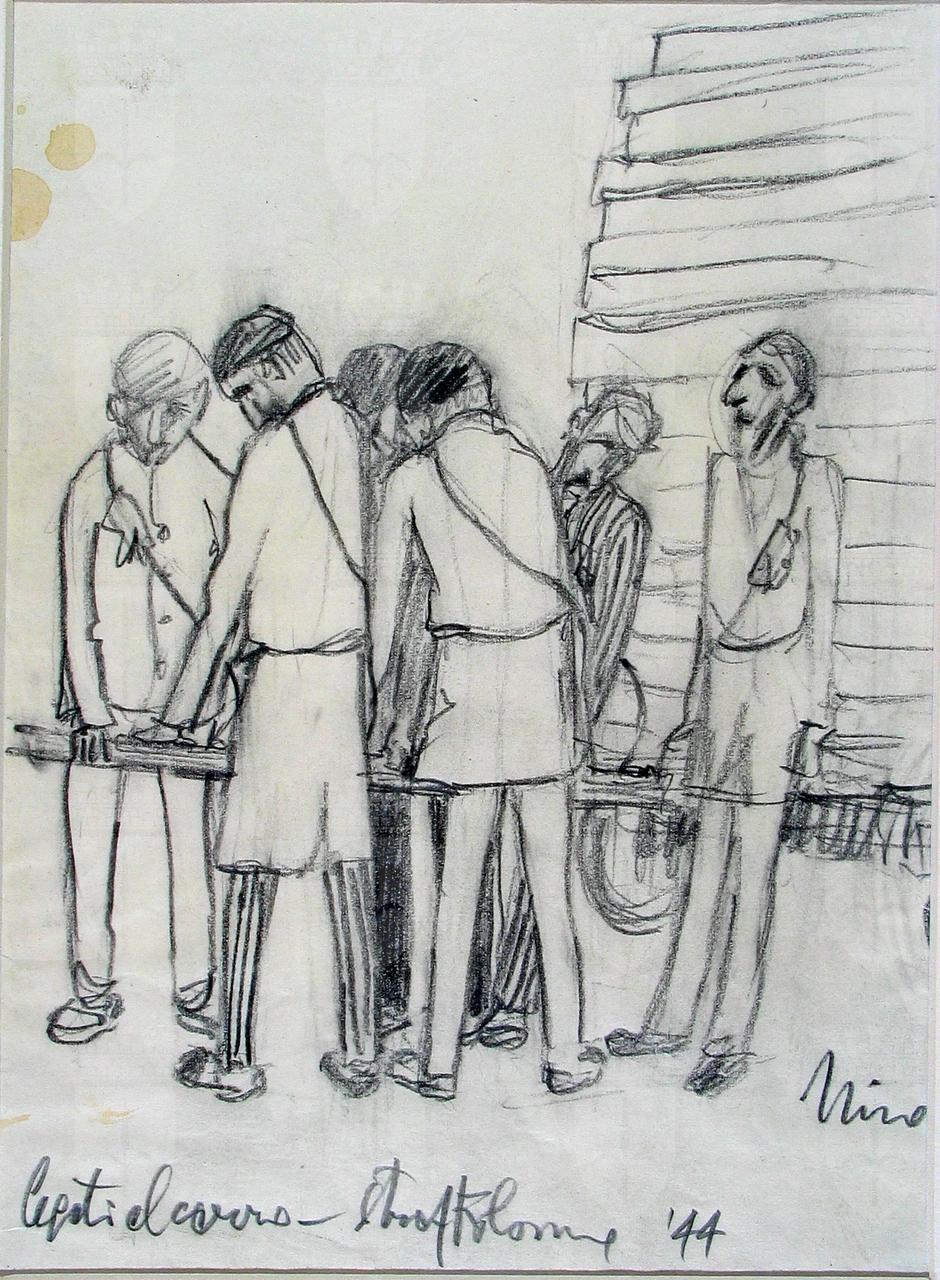 Giovanni Talleri (Trieste 1922 - 2010) fu arrestato nell'estate del 1944 e deportato nel campo di concentramento di Mühldorf, un sistema satellite del campo di Dachau, in Germania, da qui trasferito a Strub, da dove riuscì a evadere e da lì a ritornare nella sua città natale. Nelle settimane successive il rientro a casa, ha realizzato questa serie di disegni a matita in cui ha rappresentato quanto ha visto durante la prigionia: i portatori di cemento, le guardie, le donne russe, i prigionieri ebrei e quelli della Straf-Kolonne di Mühldorf. In questo foglio emerge l'enorme fatica del lavoro a cui erano costretti i prigionieri, legati a un carro che trasporta un gran quantitativo di quelle che hanno l'aspetto di lunghe travi. Sappiamo che il cantiere di Mühldorf prevedeva la costruzione di una galleria in cemento armato, camuffata da collina con vegetazione posticcia, alta 35 metri, larga 120 e lunga poco meno di 400. Sul verso del disegno, in basso a destra, c'è il timbro “GIOVANNI TALLERI / Via Crispi, 14 – 34125 Trieste / ITALIA – Tel. 638707 – 638706”.