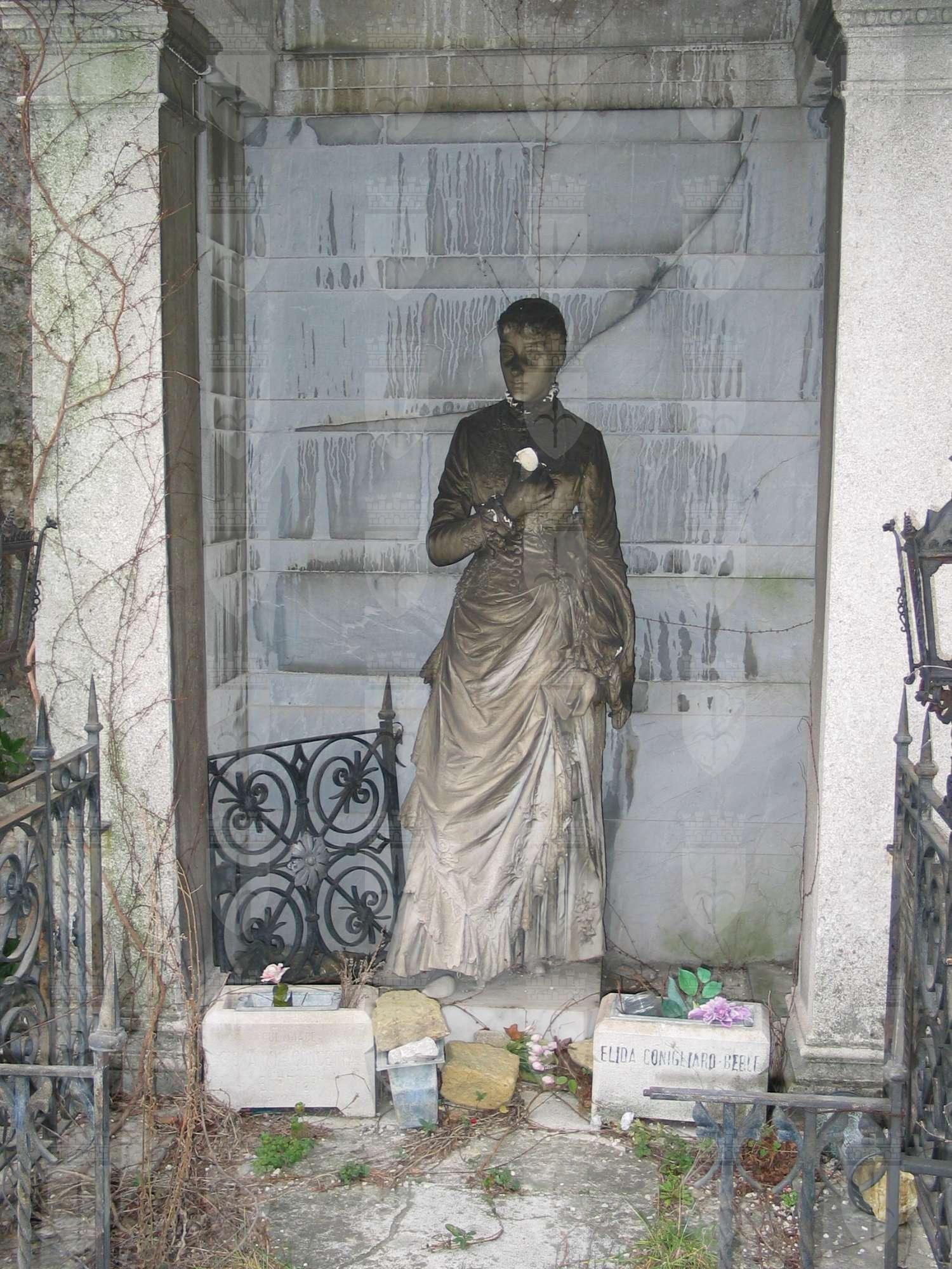 Entro un tempietto dalle forme lineari, con paraste e colonne lisce, è collocata la statua a figura intera di Elida Conigliaro, che, abbigliata secondo la moda di fine '800, porta la mano destra al petto, nell'atto di stringere un medaglione (attualmente mancante), mentre nella sinistra tiene un libro con una croce sulla copertina. Le basse cancellate laterali in ferro battuto sono decorate da lampioncini dello stesso materiale.