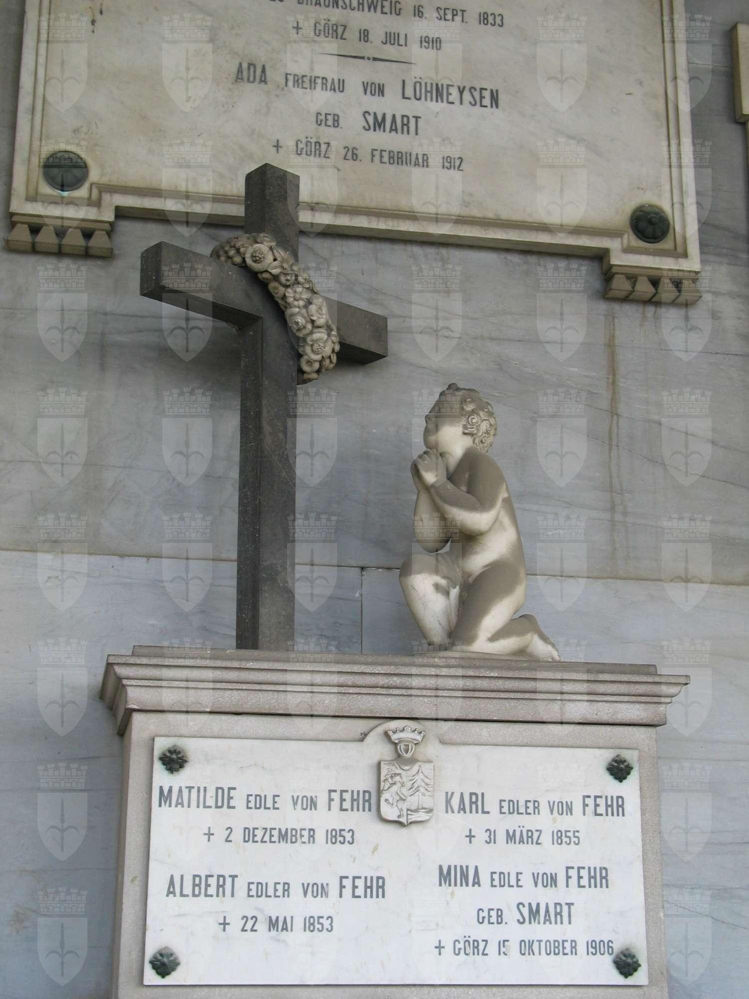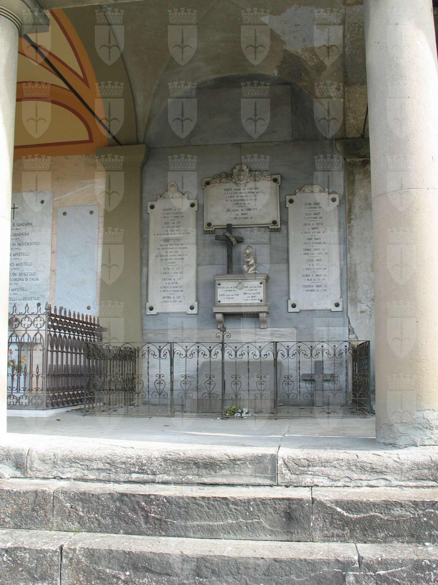 Un sarcofago di ridotte dimensioni è collocato sopra una mensola sulla parete di fondo; su di esso un puttino in preghiera è inginocchiato ai piedi di una croce ornata da una corona di fiori. Attorno al sarcofago tre grandi lapidi con iscritti i nomi dei defunti.